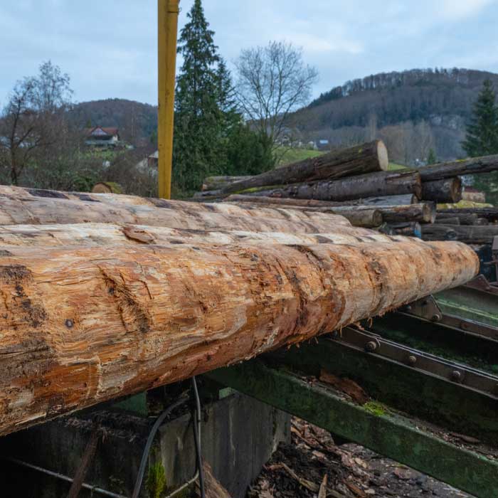 Bei uns beginnt alles im Rundholzlager: Hier werden die frisch angelieferten Baumstämme sortiert, vermessen und sachgerecht gelagert.